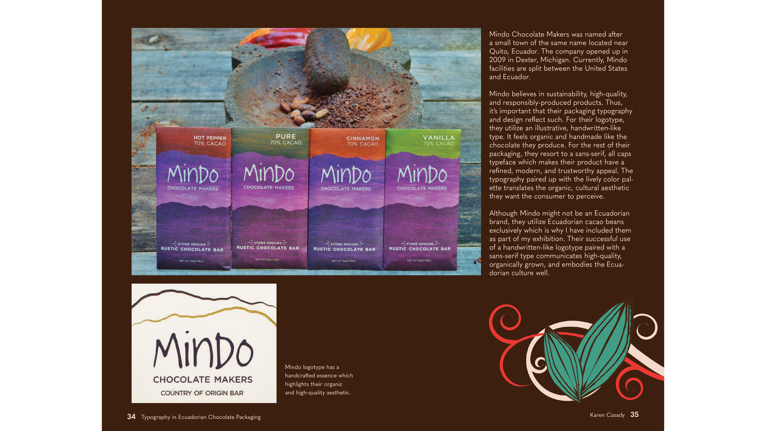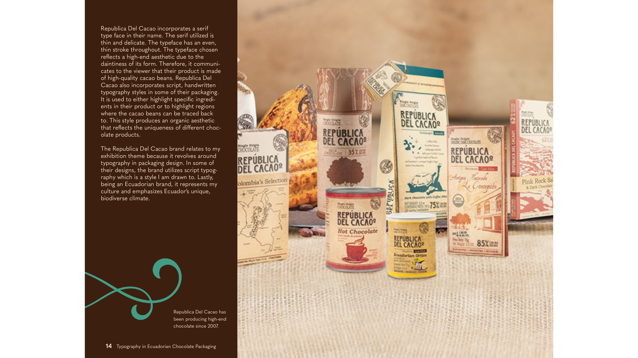 “Typography in Ecuadorian Chocolate Packaging” showcases the following brands: Republica del Cacao, Cheztiff, Mashpi, Kacau, To’ak, and Mindo. My goal was to not only immerse the viewer in a cultural, rich history of my country of Ecuador, but also accentuate the variety of typography in the packaging.